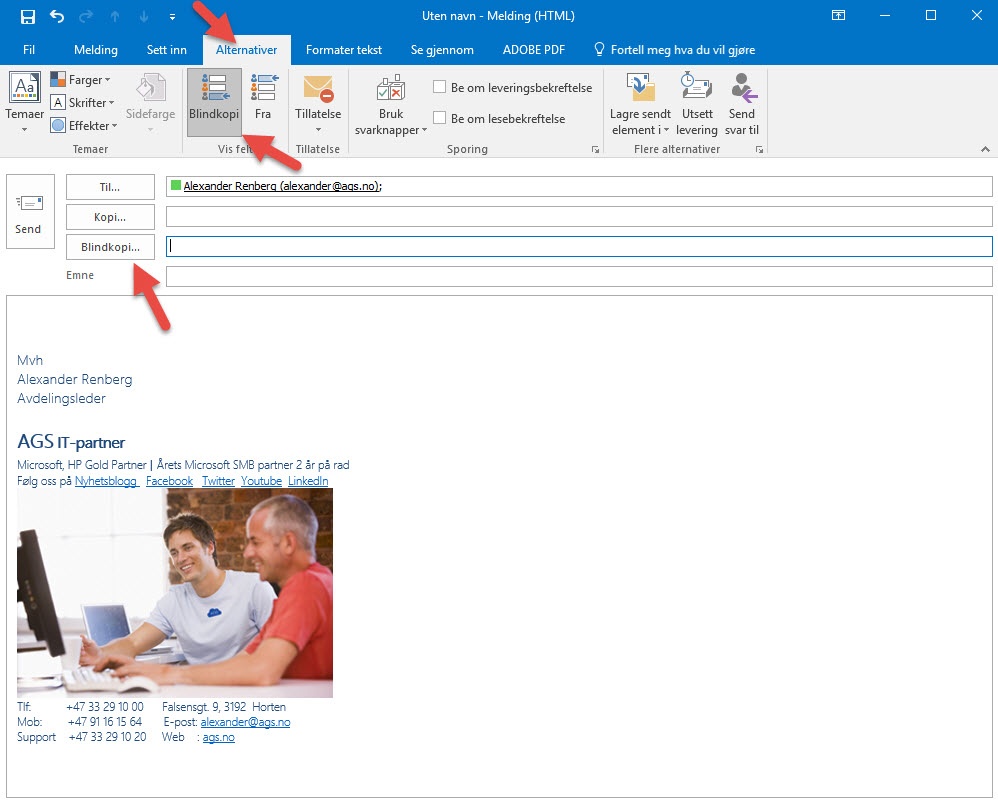 Start med å aktivere blindkopifunksjonen i Outlook dersom du kun ser <Til...> og <Kopi...> valgene når du skal sende e-posten. Du kan aktivere blindkopi funksjonen ved å trykke på <Alternativer> øverst på knapperaden og så velge <Blindkopi>. Nå får du opp <Blindkopi...> valget rett under <Kopi...>.