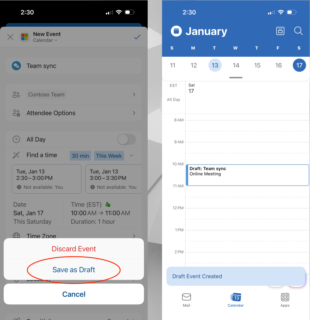 En smart kalenderfunksjon markerer også disse utkastene til e-poster og møter, og hjelper deg å holde oversikt over hva som fortsatt pågår. Dette er en liten endring med stor betydning for mobilbrukere som jonglerer kommunikasjon underveis.