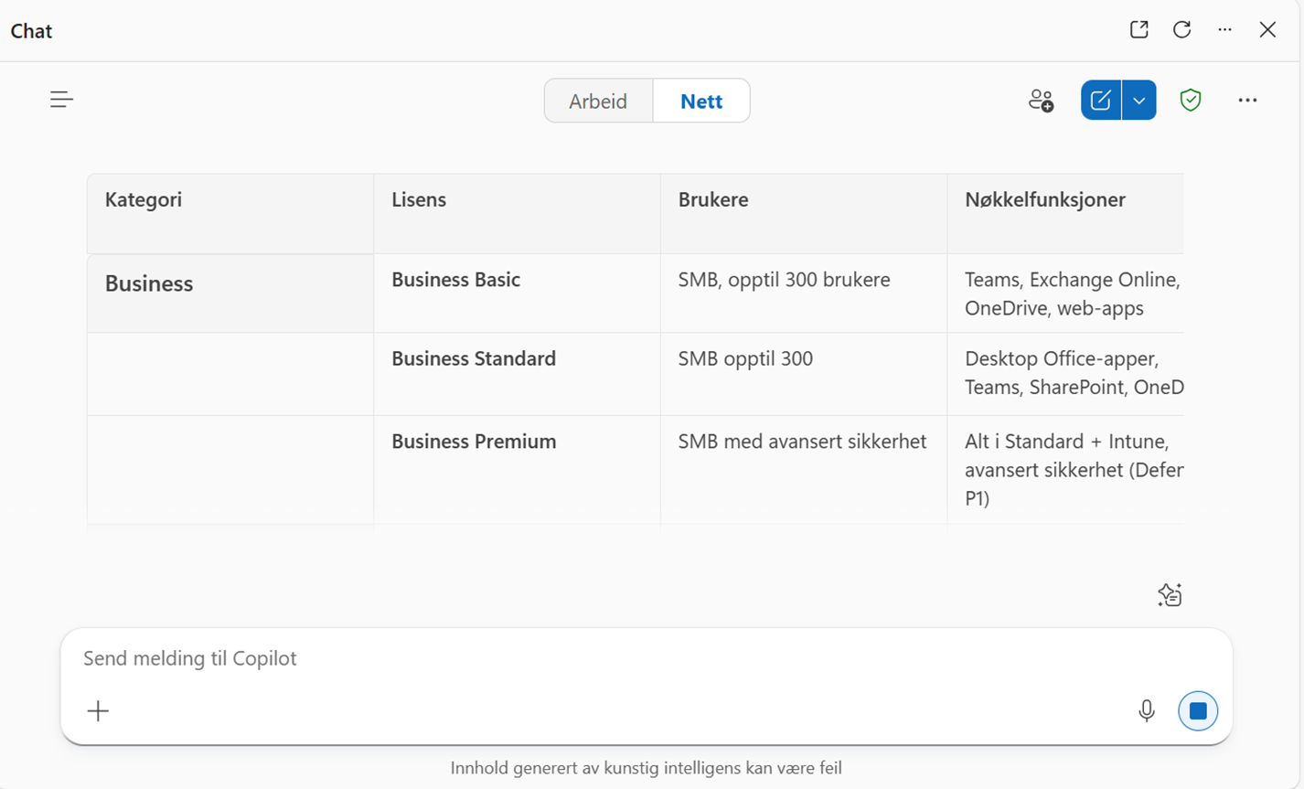 En annen liten, men kraftfull funksjon er forbedret kopiering fra AI-genererte tabeller. Når du ber Co-Pilot lage en tabell, bevarer kopieringen nå formateringen perfekt inn i Word, PowerPoint, e-post, Excel og andre apper.