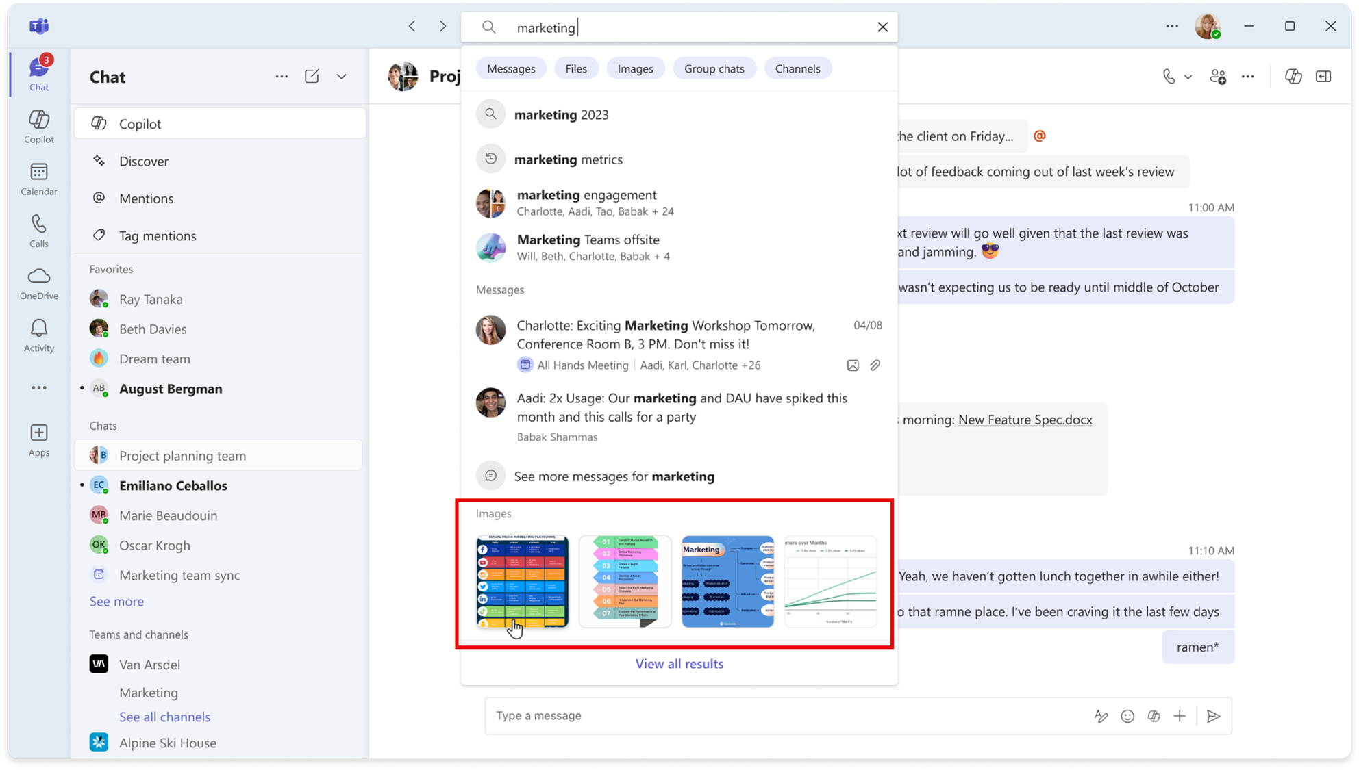 En annen smart funksjon som nå er lansert, er muligheten til å søke etter bilder i Teams. Dette gjør det enklere å finne igjen skjermbilder, slides eller bilder som er delt i kanaler eller chatter. Søket henter også informasjon fra SharePoint, noe som øker sjansen for å finne riktig bilde raskt. Denne funksjonen vil uten tvil gjøre det enklere å navigere i mengden av informasjon som ofte oppstår i Teams-chattene.