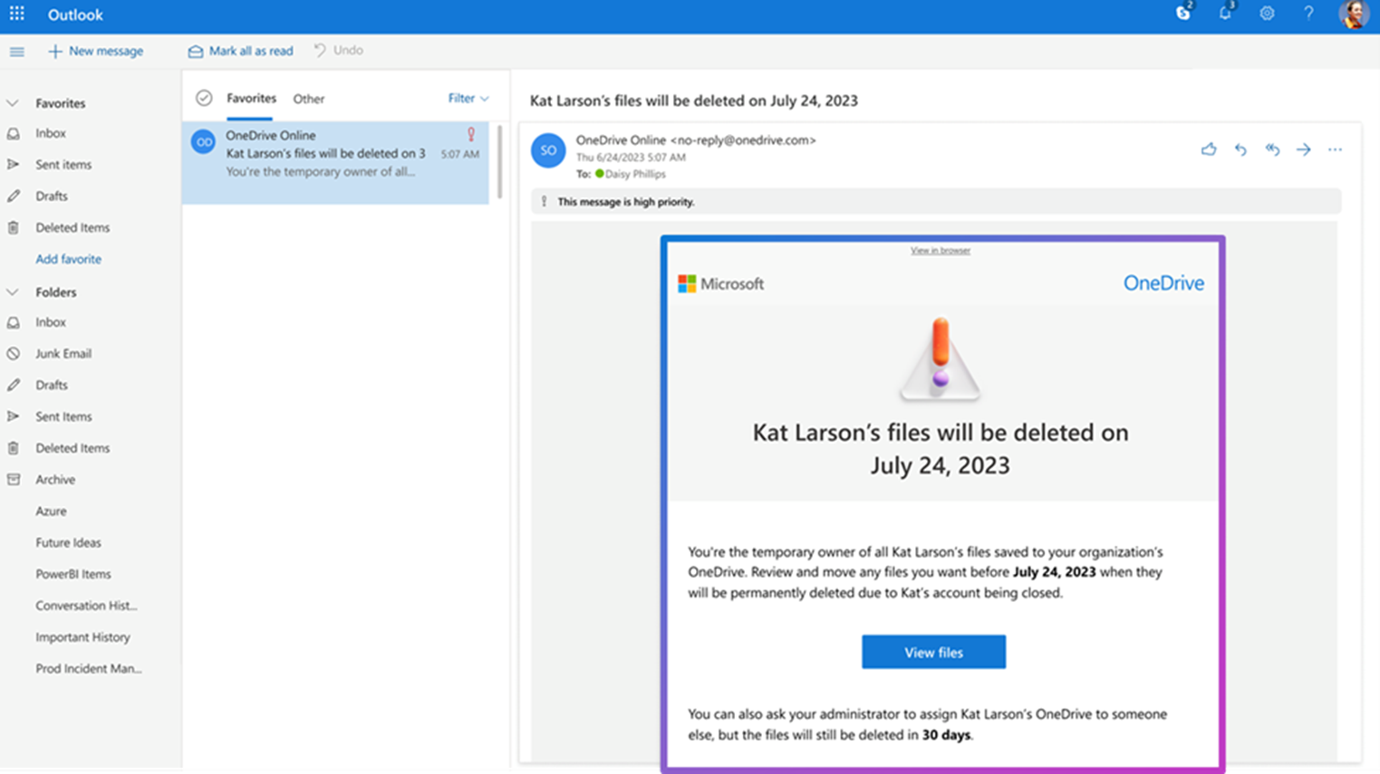 Videre har Microsoft forbedret offboarding-prosessen når ansatte slutter i en bedrift. Nå finnes det bedre rutiner og verktøy for å overføre filer som er lagret i OneDrive til andre i organisasjonen, samtidig som det tas hensyn til GDPR og personvern. Dette gjør det enklere å sikre at viktig informasjon ikke går tapt ved overgang av ansatte