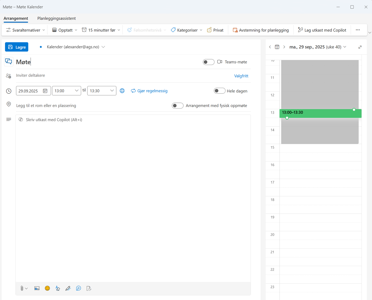 Man kan nå lagre møter eller aktiviteter som utkast, slik at man kan forberede alt før man inviterer deltakere. Praktisk for å skrive agenda og møtebeskrivelser før sending av invitasjon.