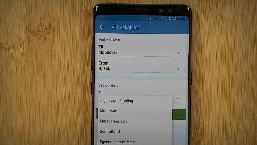 Når du er inne på viderekobling funksjonen, kan du velge imellom flere alternativ for håndtering ved ikke svar. Her kan du velge hvor samtalen skal rutes og etter hvilken tid den skal rutes.