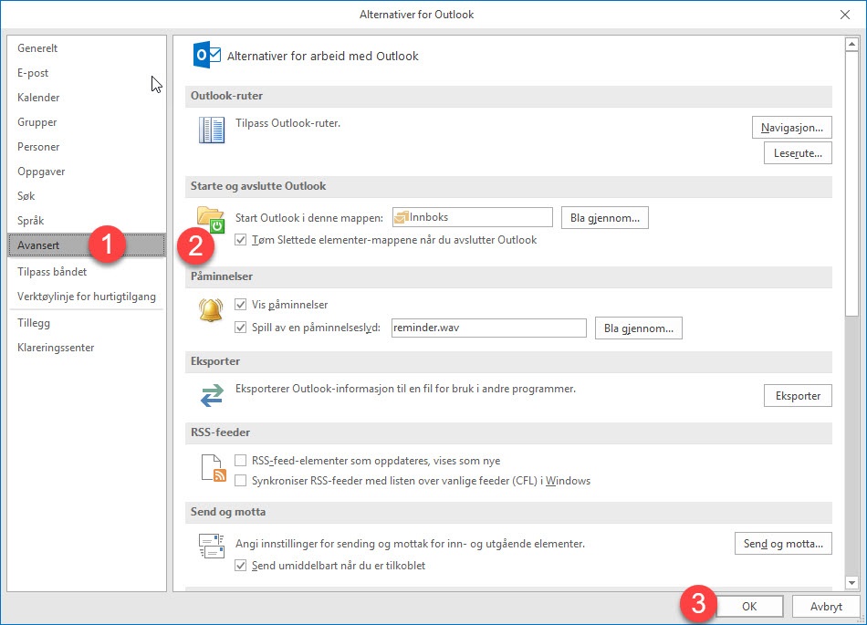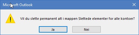 Når du nå avslutter Outlook, vil du få et kort spørsmål om du ønsker å tømme slettede elementer. Svarer du ja vil programmet bruke noen få sekunder på å tømme slettede elementer i Outlook før den avslutter. Svarer du nei forblir mappen uendret. Er du uheldig og tømmer mappen og angrer har du fortsatt en mulighet for å hente tilbake e-post igjen dersom du abonnerer på Office 365.