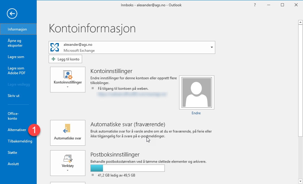 Start Outlook, å gå inn på fil-menyen. Her finner du <alternativer> lengre ned på venstre siden.