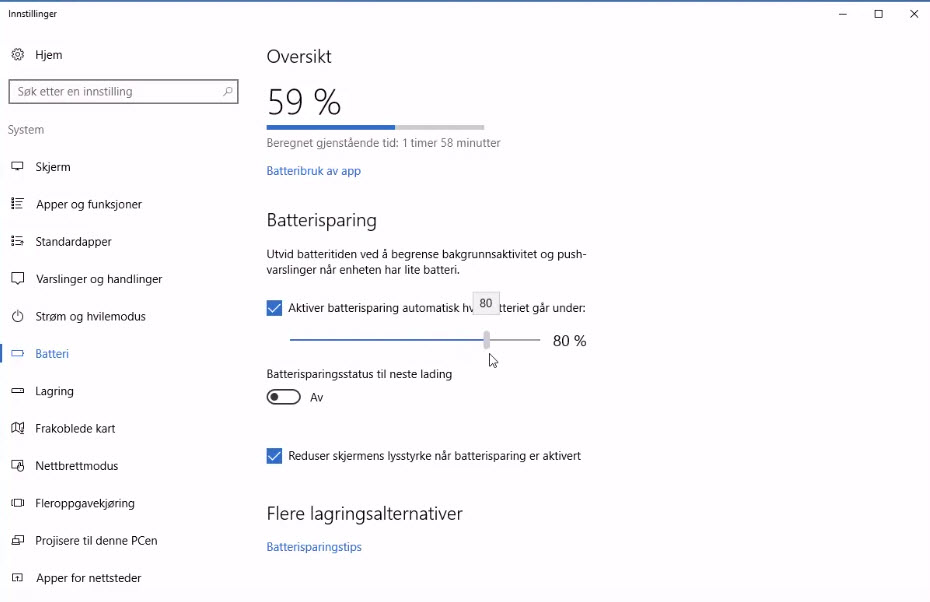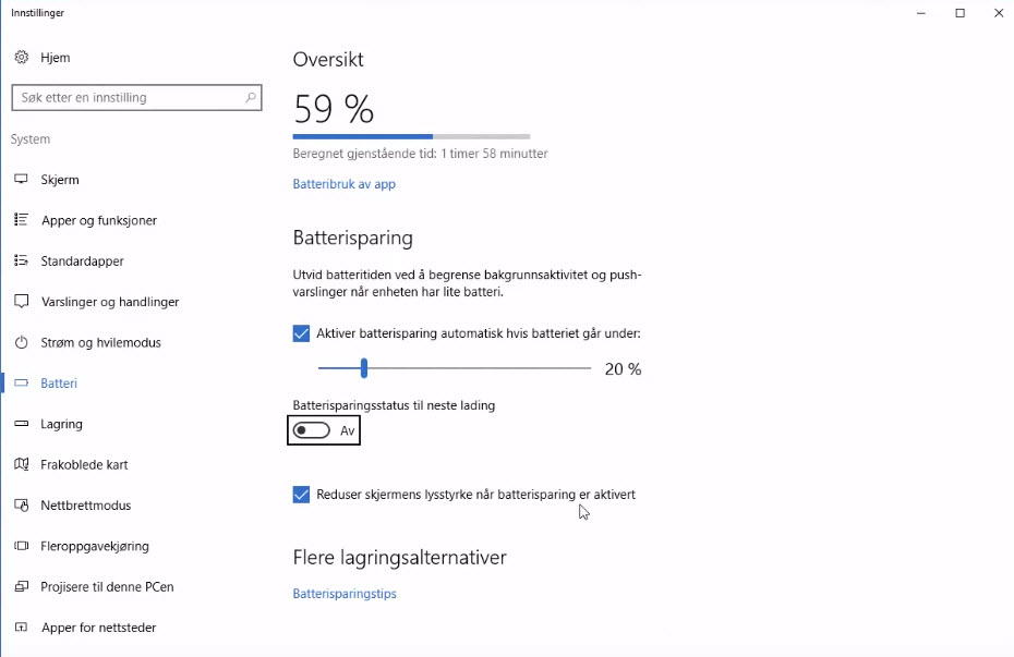 Her på ca. på midten finner du <Aktiver batterisparing automatisk hvis batteriet går under 20%>. Dette betyr at Windows 10 setter maskinen i sparemodus når batteriet har 20% strøm igjen.