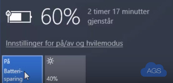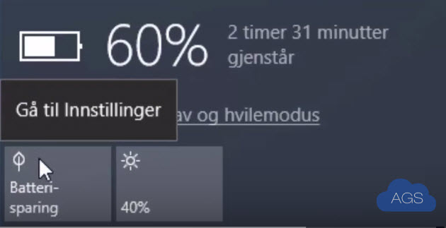 Du starter med å finne batteriinnstillingen i Windows 10. Batteriikonet finner du nede ved klokken til høyre. Klikk på denne og høyreklikk på <Batteri-sparing> og velg <Gå til innstillinger>