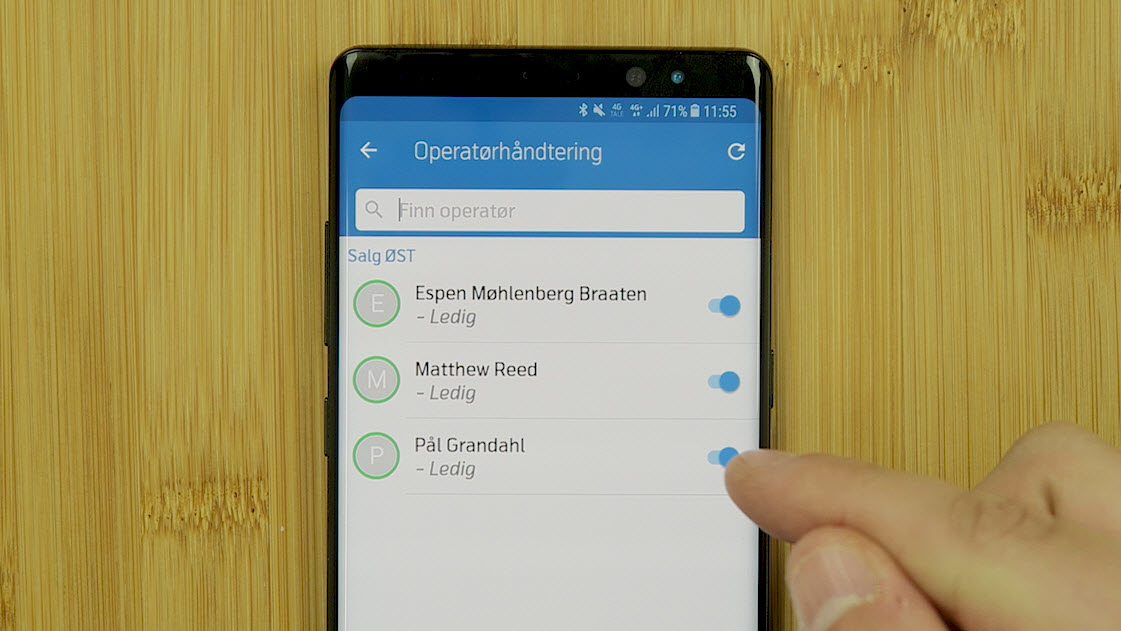 - Trykk så videre på operatørhåndtering. Her finner du alle operatører på den aktuelle køen. Her kan du enkelt logge de av og på med knappene.