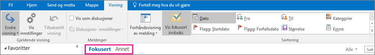 En Fokusert Innboks hjelper deg med å fokusere på e-postene som betyr mest for deg og skiller innboksen din i to mailkategorier - Fokusert og Annet. E-post som tidligere har lagt seg under rotemappen din, vil nå legge seg under fanen Annet. De viktigste e-postadressene dine er under fanen Fokusert mens resten er lett tilgjengelig under Annet. Innholdet i e-posten bestemmer hvilken fane den legger seg under. Nyhetsbrev og maskingenerert e-post er typiske eksempler på det som legger seg under fanen Annet. Du vil bli informert om e-post som flyttes til Annet, og du kan når som helst skifte mellom de to fanene, for å passe på at e-posten du mottar legger seg der du ønsker.
