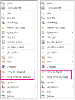 - Hvis du flytter fra Fokusert til Annet, velger du <Flytt til Annet> hvis du bare vil flytte den valgte meldingen. Velg <Flytt alltid til Annet> hvis du vil at alle fremtidige meldinger fra avsenderen skal leveres til Annet-fanen.