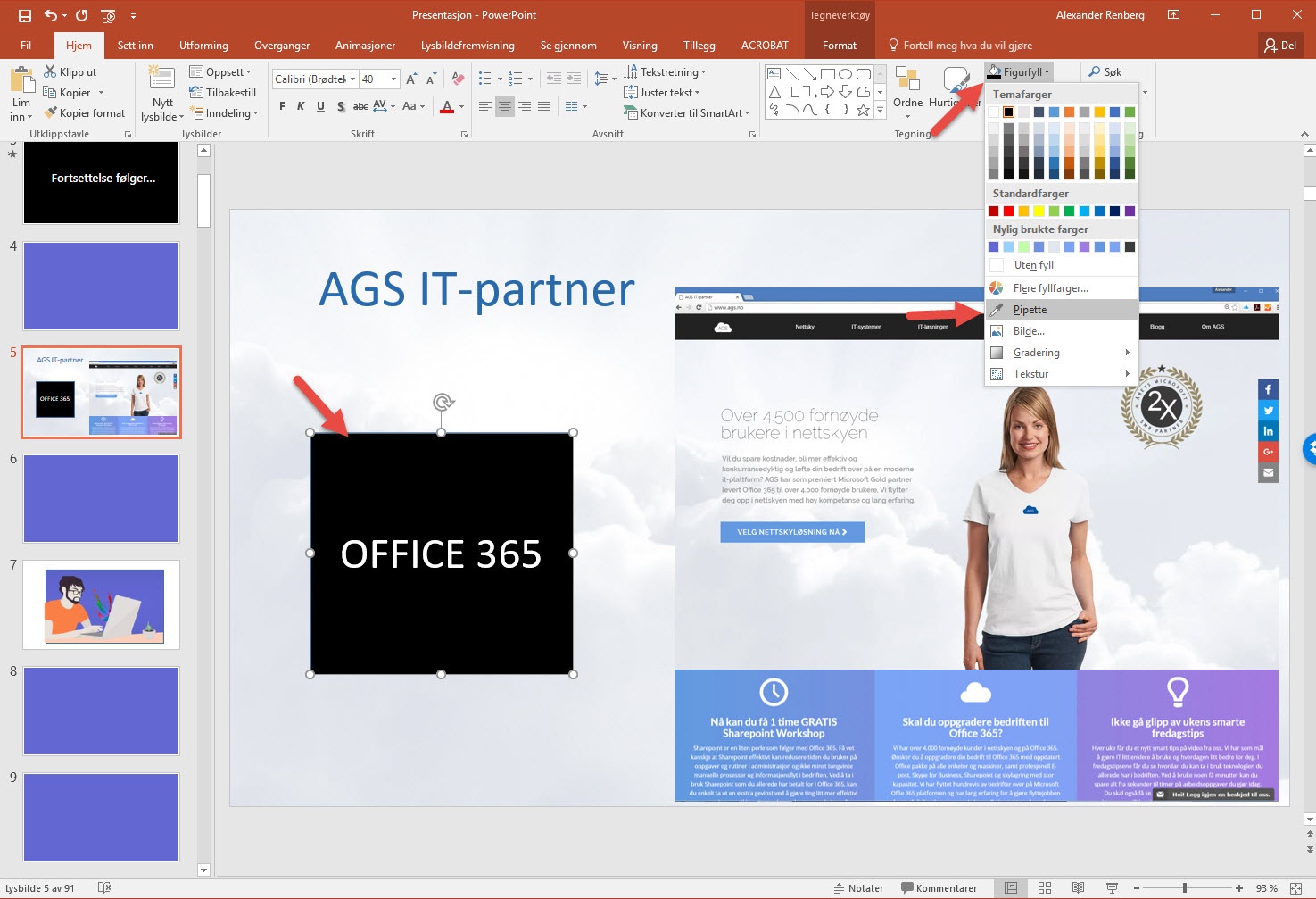 Velg først figuren du ønsker å skifte farge på, i dette tilfellet den sorte boksen merket "Office 365". Velg <figurfyll> øverst til høyre og så <Pipette>. Nå fører du Pipetten over på fargen du ønsker å replikere.