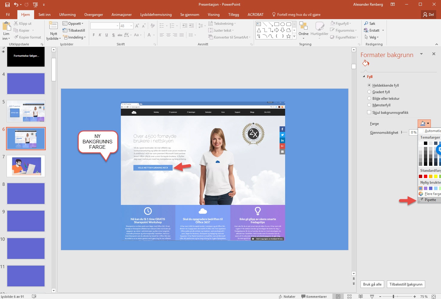 Ønsker du å skifte bakgrunnsfargen på Powerpoint sliden kan du gå frem på akkurat sammen måte.