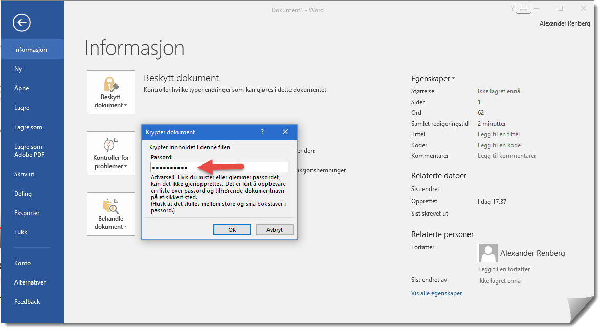 I prosessen må du gjenta det valgte passordet. Dette er praktisk i tilfelle du har vært uheldig å fått en skrivefeil eller trykket på feil bokstav slik at du ikke låser deg selv ute fra dokumentet.