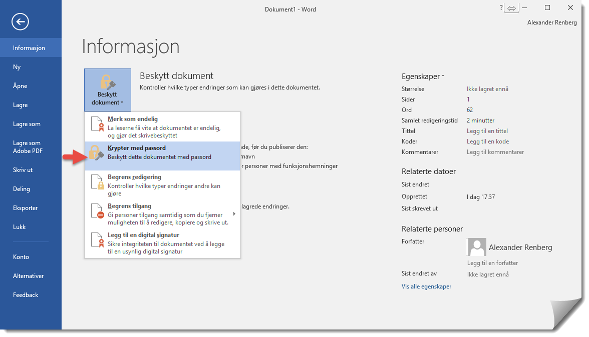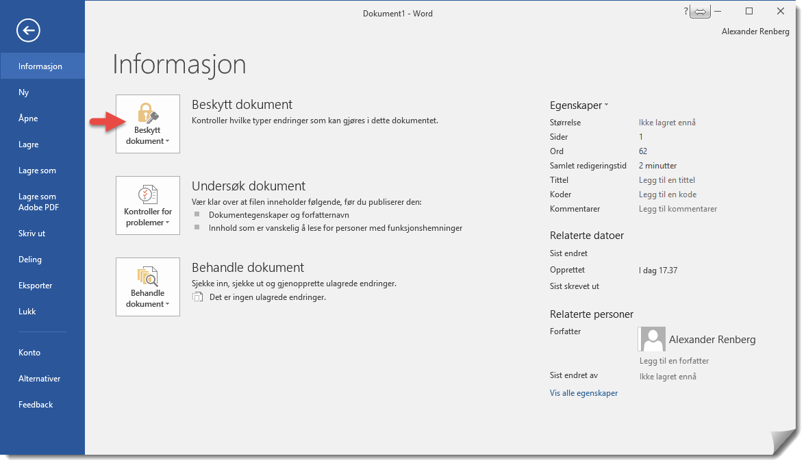 Når du har gjort dette vil du se et valg øverst under <informasjon> som heter <Beskytt Dokument>