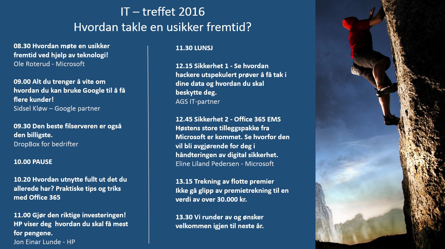 Vi har noen få plasser igjen til Årets IT-treff. Dersom du ønsker å melde deg på, kan du gjøre dette her! Til alle dere som har meldt dere på, vi ses på IT-treffet på torsdag.