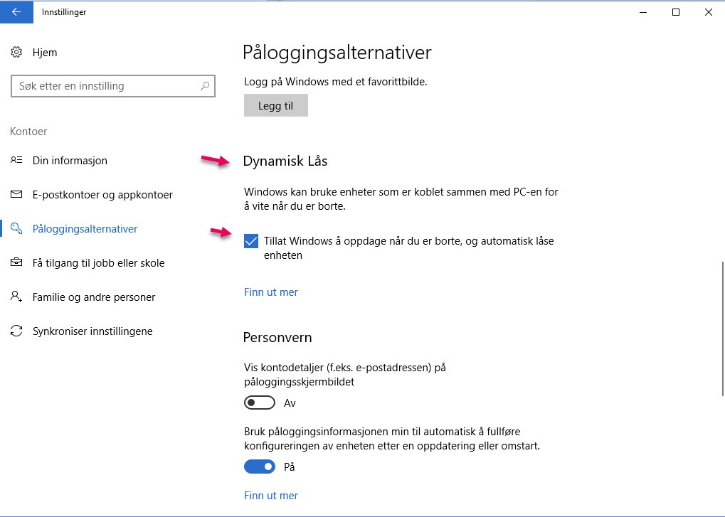 - Gå inn på <Påloggings alternativer> og skroll ned på siden til du finner <Dynamisk lås>.