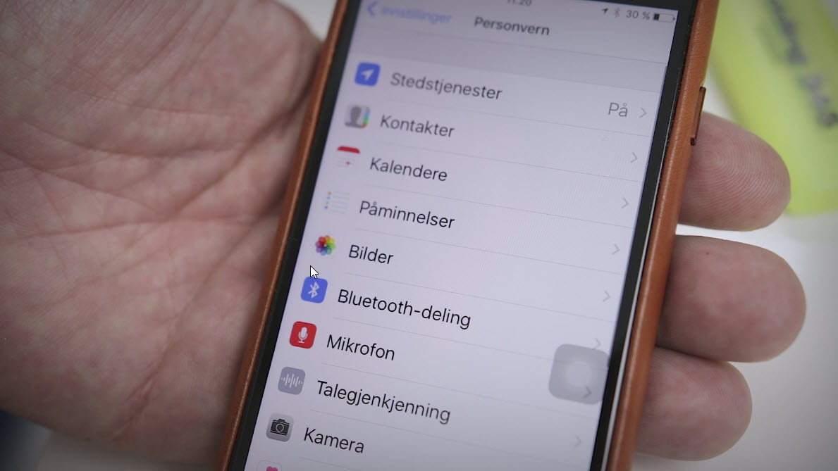 På iPhone går du inn på <Innstillinger> etterfulgt av <Personvern> og skru av <Stedstjenester>. Skru på <Tilgang til Stedsinformasjonen min> ved å trykke på samme knapp som når du slo den på.