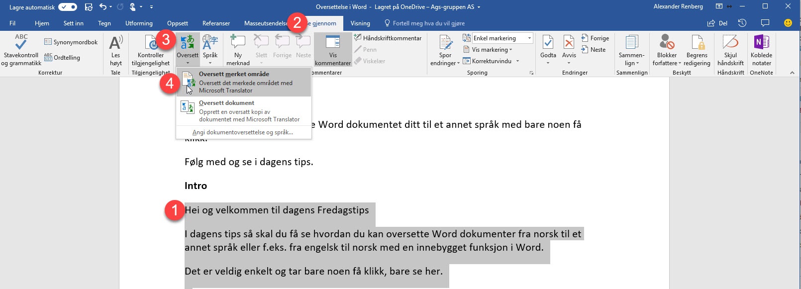 Visste du at du kan oversette Word dokumentet ditt til et annet språk med bare noen få klikk. I dette tipset så skal du få se hvordan du enkelt kan oversette Word dokumenter fra norsk eller er annet språk til f.eks. Engelsk. I eksemplet her skal du få se hvordan du oversetter dokumentet fra Norsk til Engelsk.
