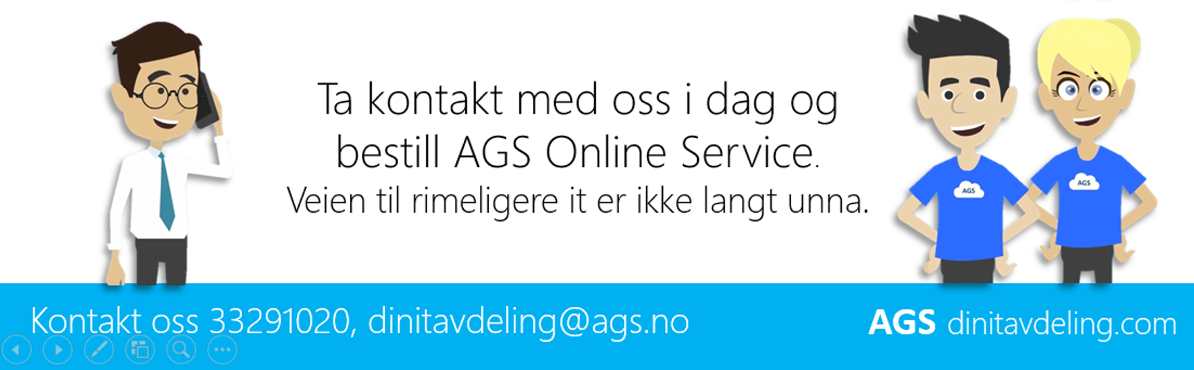 Fra Januar 2014 vil AGS dinitavdeling.com levere en løsning som vil redusere dine IT kostnader, og samtidig gi deg en topp moderne driftsløsning på IT. Vi ønsker at våre kunder skal få et moderne og bedre system til å ta seg av driften. Ved å ta i bruk nettskyen har vi nå klart å få på plass en løsning som vil gi deg bedre drift for samme pris som før, eller også rimeligere. Vi har laget en video som forklarer deg alt du trenger å vite om AGS Online Service på 2 minutter. Se den her.