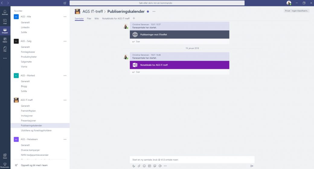 Ved å opprette et Team for ulike prosjekter eller avdelinger får du engasjert de medlemmene som skal involveres og du får satt alt mer i system. Du har mulighet til å dele og redigere dokumenter, sortere ut viktige elementer, lage sjekklister, jobbe med tidsplaner og fordele oppgaver gjennom Microsoft Planner.