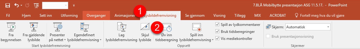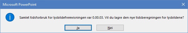Når du har kjørt gjennom hele presentasjonen så vil du få beskjed om hvor lang tid presentasjonen varer, og om du vil lagre denne tidsberegningen for presentasjonen din. Her er det bare å svare <ja>.