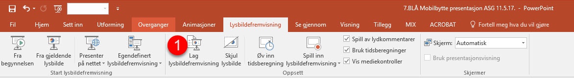 For å starte din nye selvgående PowerPoint presentasjon går du inn på <Lag lysbildefremvisning>. Her skal du sjekke at <Automatisk visning av hele skjermen> er huket av.