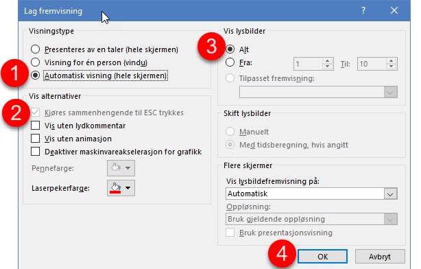 Sjekk at <Kjøre sammenhengende til ESC trykkes> er huket av. Hvis ikke du ønsker å definere hvilke slides du ønsker å kjøre, velger du <Alt> og trykker <OK> så er du klar. Nå gjenstår det bare å trykke på <Lysbildefremvisning> og kjøre presentasjonen som du pleier. Gratulerer! Du har nå en selvkjørende PowerPoint presentasjonen som kan kjøre helt auto-magisk av seg selv, igjen, og igjen, og igjen. Helt frem til du trykker <ESC> tastet.