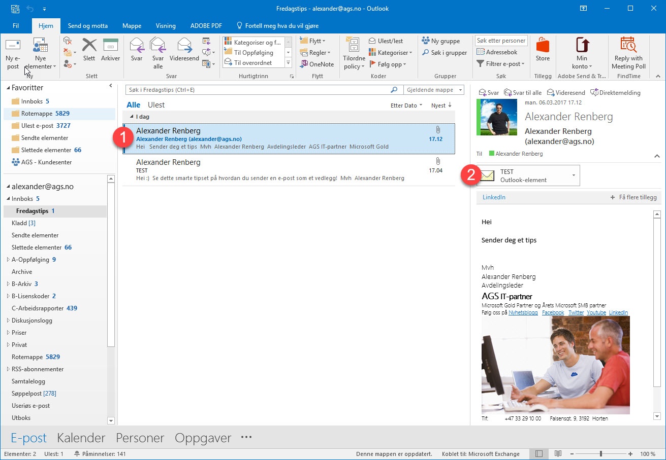 Her kan du se at e-posten som du har sendt, ligger i innboksen hos mottakeren, og at vedlegget ligger klart. Mottakeren kan nå åpne eller lagre en kopi av den originale e-posten. Så enkelt er det å sende en e-post som vedlegg.