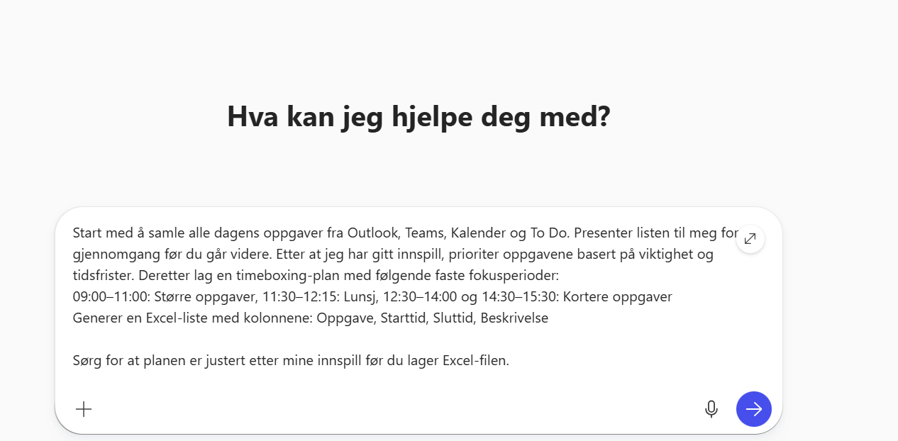 Jeg starter med en prompt som gir Copilot en tydelig arbeidsflyt: