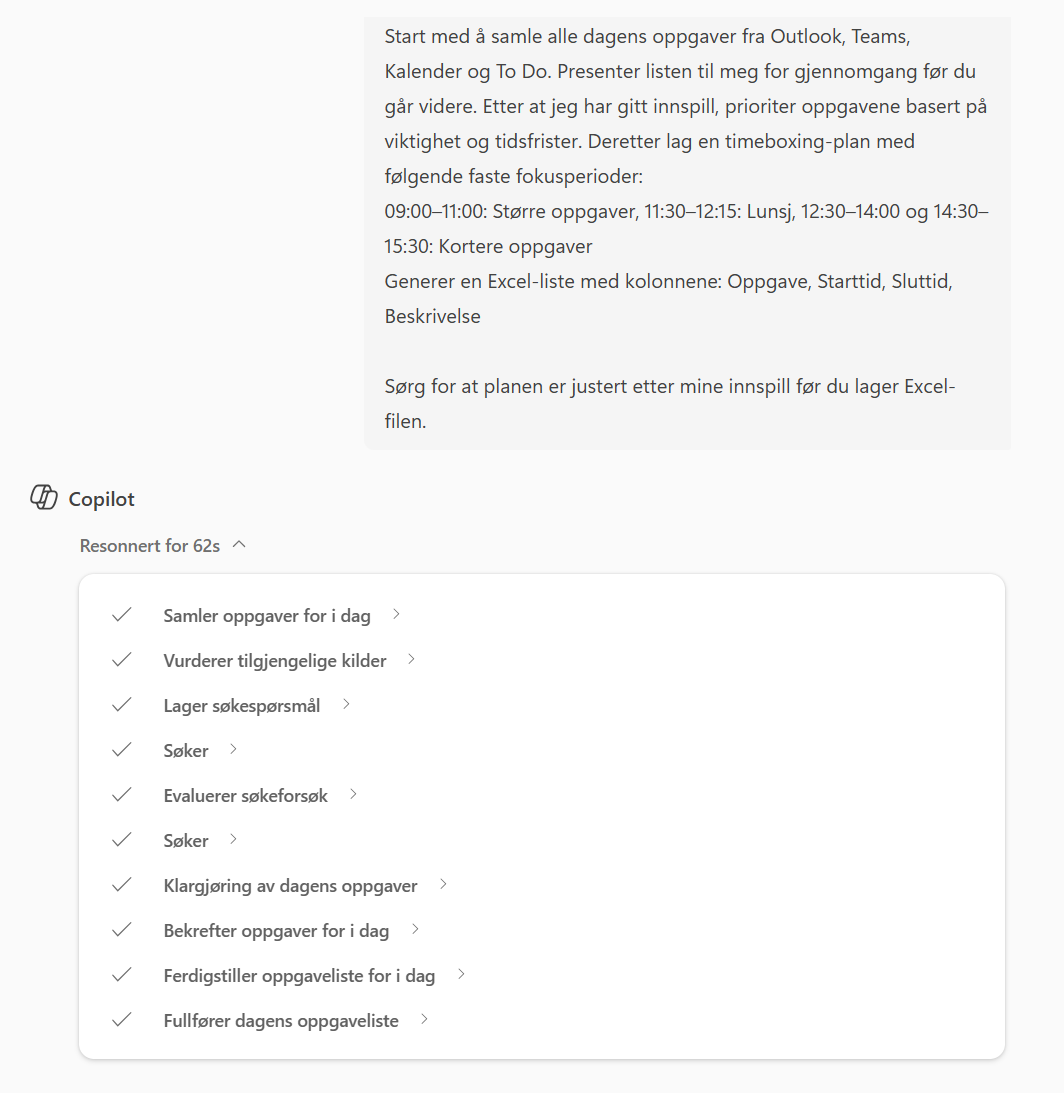 - Copilot henter oppgavene fra mine kilder (Outlook, Planner, To Do).